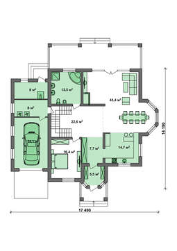 Для приема гостей выделено значительное пространство, которое представлено немалой столовой, просторной кухней и большими гостевыми покоями, места хватит для азартных молодежных вечеринок, наполненных детским весельем и задорным смехом утренников, а также торжественных светских встреч и празднеств, которые отличают дружные и большие семьи. Предусмотренный отдельный выход из гостиной прямо в загородный простор максимально приближает строение к природе и позволяет бесконечно долго любоваться ее красотою.