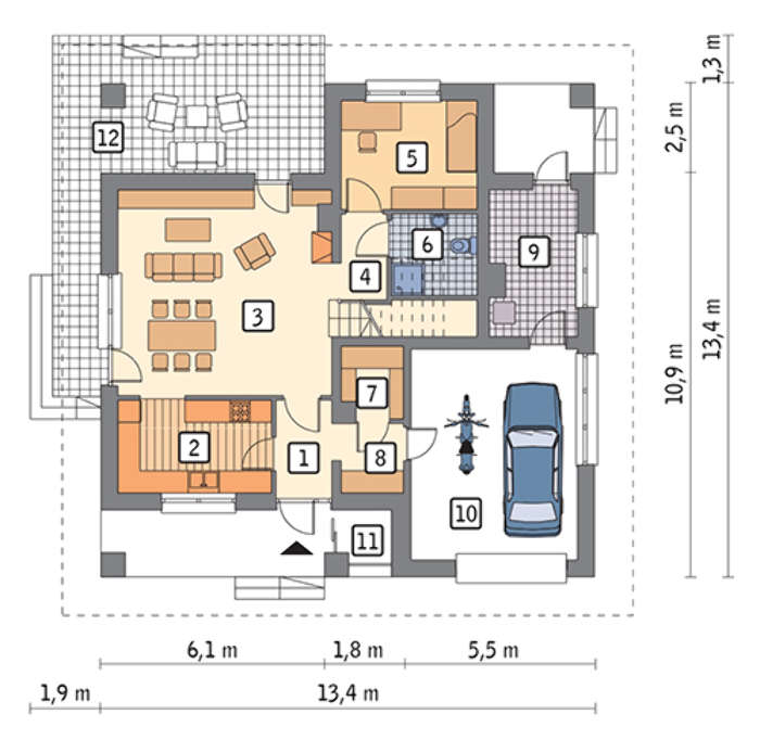 Проект содержит три раздела – АрхитектурныйКонструктивный и Инженерный: водоснабжение, отопление, вентиляция, канализация, электроснабжение (приобретается за дополнительную плату) + Пояснительная записка.