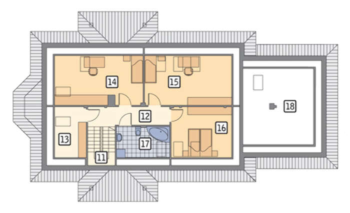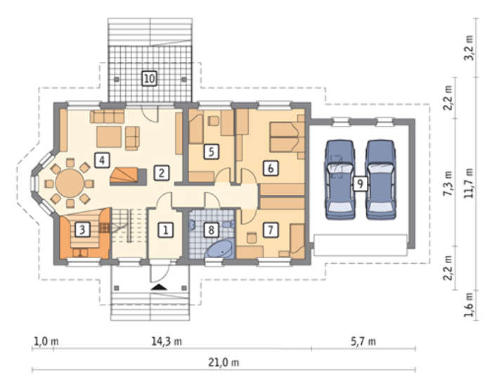 Дом в два этажа с мансардой подойдет для большой семьи, состоящей из 7 человек. Несмотря на скромные габариты, здание имеет значительную площадь в 322 кв. м.