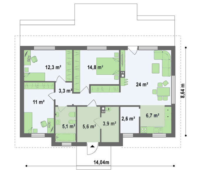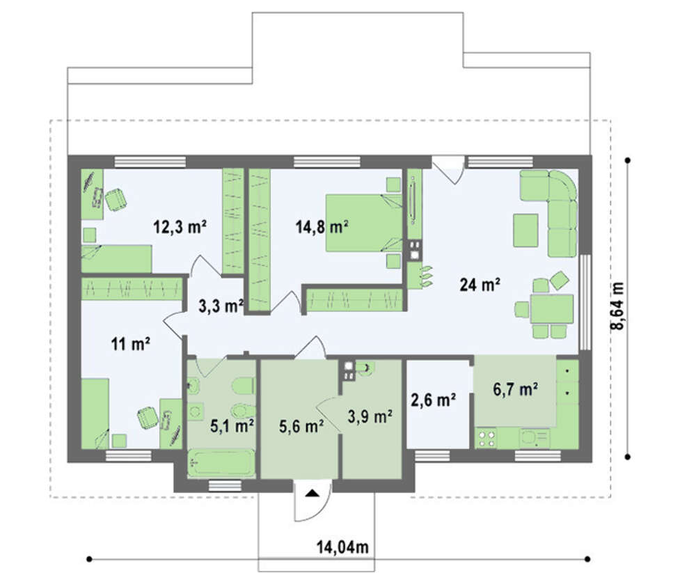Проект содержит три раздела – Архитектурный, Конструктивный и Инженерный: водоснабжение, отопление, вентиляция, канализация, электроснабжение (приобретается за дополнительную плату) + Пояснительная записка.