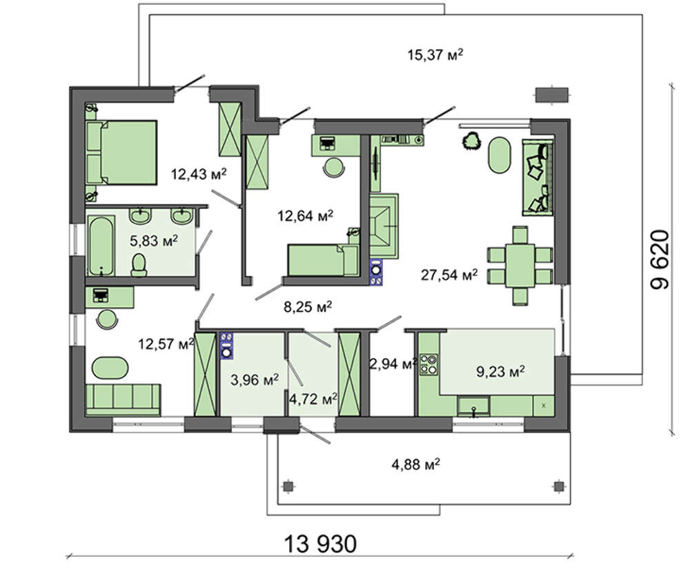 Интерьер организован традиционно. Все пространство дома жестко делится на дневную и ночную зону. Но если вы захотите придать своему дому индивидуальный вид, то можно "пофантазировать", перестраивая дневную зону. Благо, минимум несущих стен позволяет объединить помещения или, наоборот, разграничить стенными перегородками функциональные блоки.