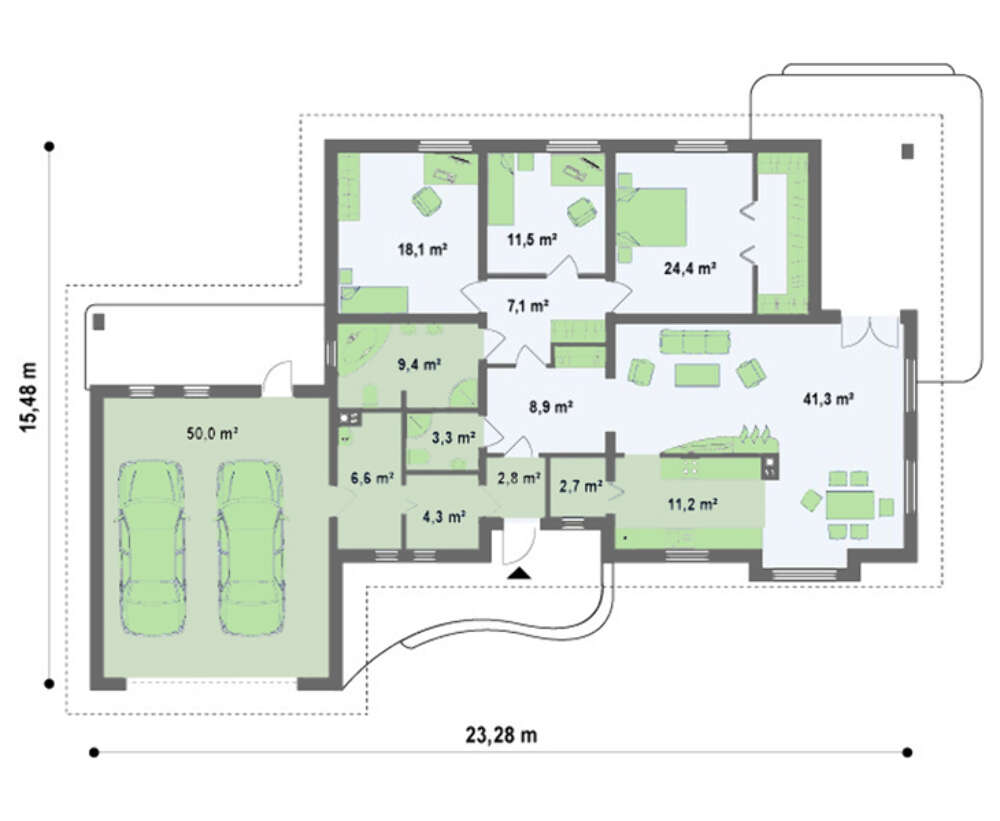Проект просторного одноэтажного коттеджа с гаражом для двух машин