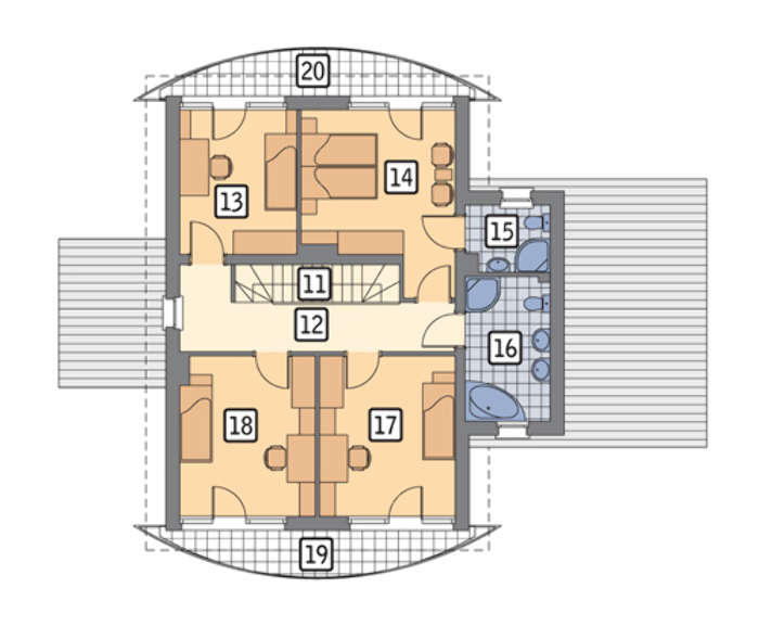 В пространстве жилого дома предусмотрено пять спальных помещений, одно из которых, размещенное на первом этаже, более соответствует образу жизни старших членов семьи. Из четырех спален второго уровня наибольшим комфортом выделены хозяйские апартаменты, в состав которых включен личный санузел.