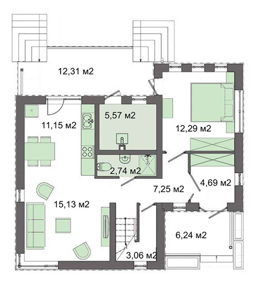 Внутренняя планировка выполнена в классическом стиле. На первом этаже поместили просторную гостиную площадью 26,3 кв. м., полученную за счет слияния зоны отдыха, столовой и кухни. Отсутствие перегородок делает помещение невероятно большим, а соседство с террасой позволяет его расширить вдвое.  Комната отдыха нижнего уровня используется в качестве спальни для старшего поколения или гостей.