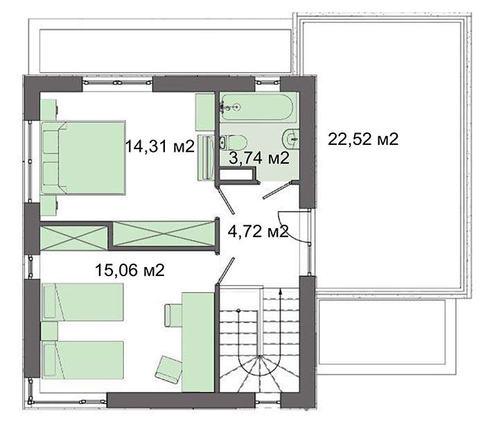 Гордость второго этажа – открытая терраса. Летом здесь можно отдыхать, принимая солнечные ванны. Наверху находятся две спальни для членов семьи и санузел.