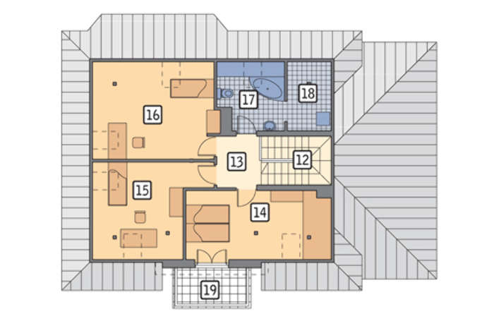 Второй этаж рассчитан на три личные комнаты, не слишком отличающиеся по площади. За счет собственного вместительного балкона апартаменты хозяина получили явное преимущество.