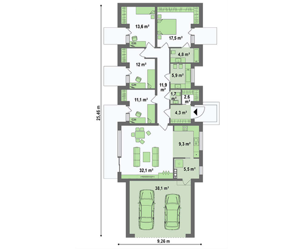 Проект содержит три раздела – АрхитектурныйКонструктивный и Инженерный: водоснабжение, отопление, вентиляция, канализация, электроснабжение (приобретается за дополнительную плату) + Пояснительная записка.