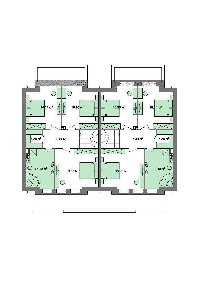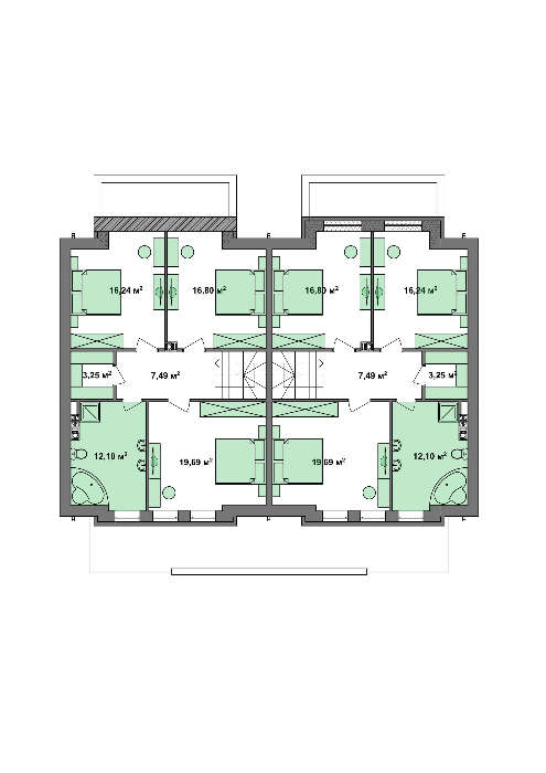 Проект жилого дома состоит из двух зеркально расположенных квартир. Каждая включает просторный гараж на один автомобиль с множеством подсобных помещений, их можно использовать для размещения инструментов, съестных припасов, организации мастерской и топочной.
