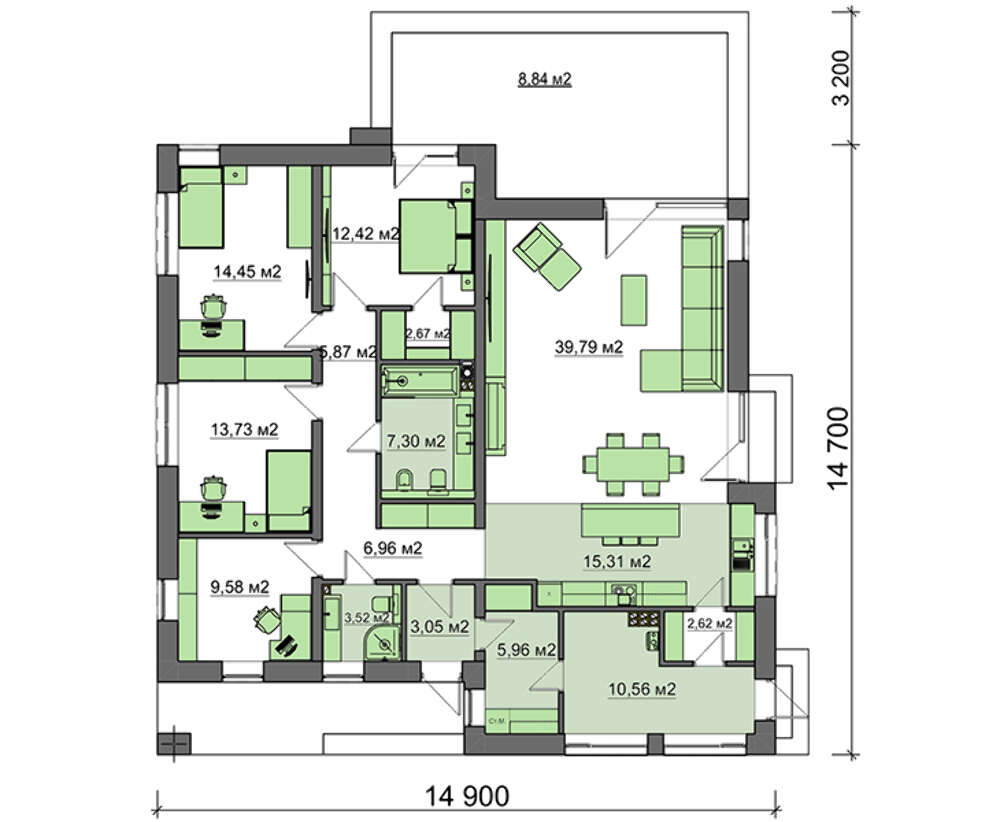 Проект содержит три раздела – Архитектурный, Конструктивный и Инженерный: водоснабжение, отопление, вентиляция, канализация, электроснабжение (приобретается за дополнительную плату) + Пояснительная записка.
