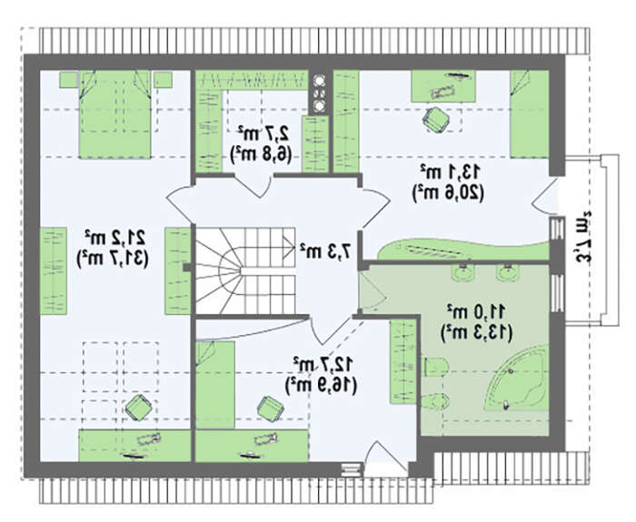 Оптимальная организация пространства второго этажа позволяет каждому члену семьи найти в нем свое место. Просторные спальни, большая ванная комната и вместительная гардеробная образуют уютную ночную зону.