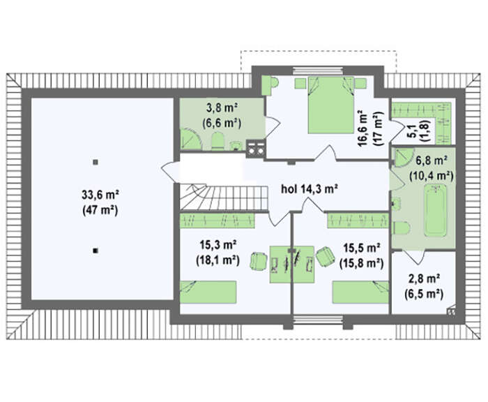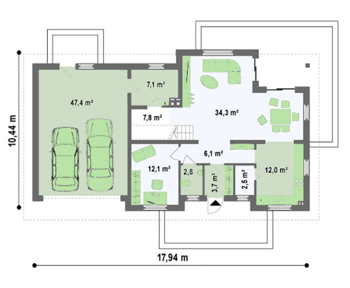 Дополнительным преимуществом станет чердак над теплым гаражом для двух авто. Его вполне можно использовать для расширения жизненного пространства, будь то жилые помещения или бильярдная с зимним садом.