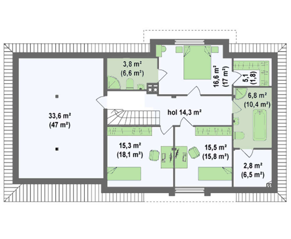 Но вы ведь совсем не против, чтобы в доме были не только общие помещения, но и приватные зоны. Для этого есть второй этаж, где расположены спальни членов семьи и ванная, совмещенная с комнатой, в которой можно обустроить прачечную.