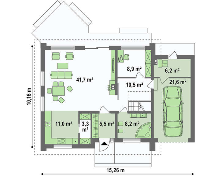 Проект содержит три раздела – АрхитектурныйКонструктивный и Инженерный: водоснабжение, отопление, вентиляция, канализация, электроснабжение (приобретается за дополнительную плату) + Пояснительная записка.