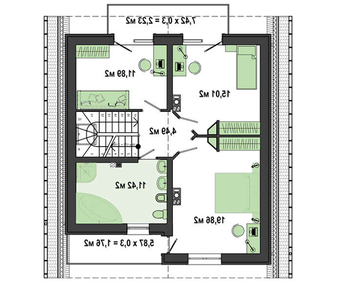 Проект содержит три раздела – Архитектурный, Конструктивный и Инженерный: водоснабжение, отопление, вентиляция, канализация, электроснабжение (приобретается за дополнительную плату) + Пояснительная записка.