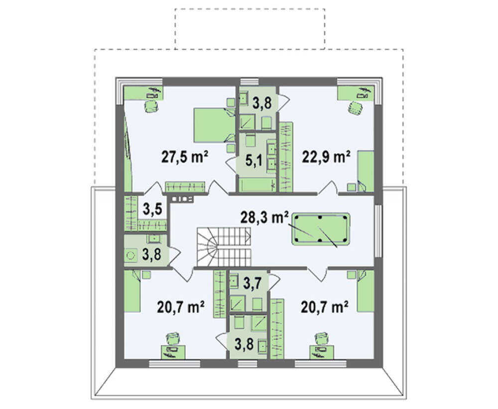 Особо стоит отметить площади помещений. Они просторны и дарят ощущение свободы и тепла. Например, каждая из четырех спален в мансарде занимает больше 20 м2 и обустроена собственной ванной. А в просторном холле возле лестницы без труда можно организовать бильярдную.