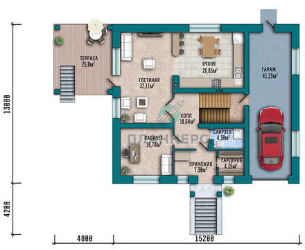 Комната отдыха в 16,78 кв. м оформлена как кабинет хозяина. Но при необходимости она может быть переоборудова для члена семьи с ограниченными возможностями. На оставшейся площади находится прихожая с гардеробом, санузел и холл с лестницей.