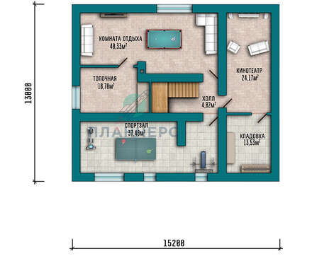 Территория цокольного этажа используется как зона отдыха. Здесь расположен домашний кинотеатр, спортзал с тренажерами и теннисным столом, биллиардная с баром. Имеется котельная и кладовая. Верхний уровень – личная территория жильцов, здесь две спальни, два санузла и комната для гостей. В пристроенном помещении на первом этаже находится гараж для хранения и обслуживания автомобиля, а на втором две детских спальни.