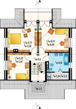 Для личного времени жильцов выделены четыре спальни. Одна из них уединена на первом этаже и при желании легко трансформируется в кабинет или детскую. Три больших полноценных горенки второго этажа имеют достаточно места для размещения спального комплекта мебели. Немалый красивый балкон, надежно защищенный от атмосферных посягательств живописной кровлею, добавляет благоустроенности и делает помещения еще более комфортными.