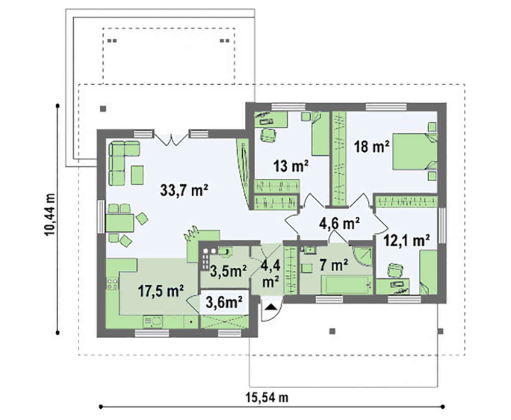 Одноэтажный дом с многоскатной крышей заинтересует тех, кто предпочитает компактное функциональное жилье. Проект представляет собой дом традиционной постройки для современной семьи.