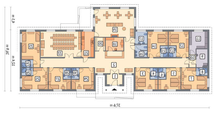 Проект содержит три раздела – Архитектурный, Конструктивный и Инженерный: водоснабжение, отопление, вентиляция, канализация, электроснабжение (приобретается за дополнительную плату) + Пояснительная записка.