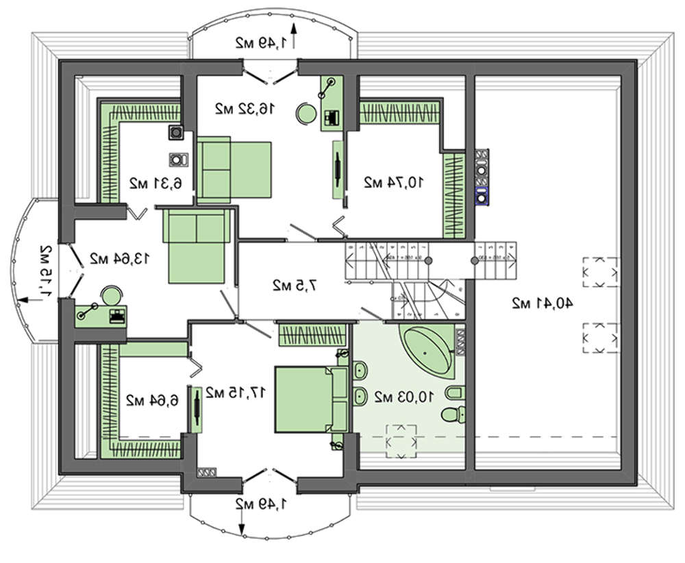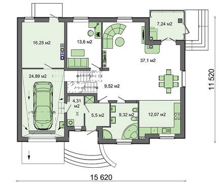 Внутреннее пространство дома тщательно распланировано с присущим европейцам рационализмом. Каждый метр площади несет свою функциональную нагрузку. На первом этаже центральное место занимает гостиная. Это большой зал с зоной отдыха, столовой и кухней. За счет объединения получена просторная комната, площадь которой увеличивает застекленная веранда. Особой популярностью пользуется личный кабинет владельца дома. При необходимости его можно переоборудовать в комнату отдыха для гостей или спальню для старших членов семьи.