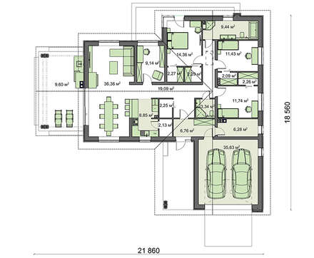Особенностью дома стали просторные веранды. Г-образная форма помогает получить защищенные от ветра пространства, где в любое время года можно отдыхать, устраивать вечеринки-барбекю и просто наслаждаться красотою цветочно-травяных композиций. Внутренняя часть дома разделена на три блока, каждый из них выполнен обособленно. Несмотря на постройку в один уровень, здесь можно одновременно принимать гостей, отдыхать и выполнять работы по обслуживанию авто, не мешая друг другу.