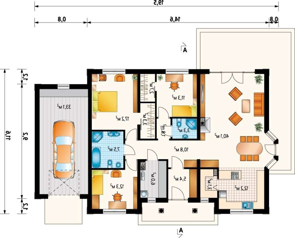 Просторный коттедж с четырьмя комнатами и гаражом за счет своей одноэтажной постройки смотрится основательно и широко. Контрастные серый и желтый цвета дополняют друг друга. Дымчатый приобретает новые приятные и свежие оттенки, а желтому передается аристократический благородный лоск. Черная четырехскатная крыша покрывает это чудесное творение и завершает образ. Такие дома отлично смотрятся внутри любого загородного приусадебного пейзажа. На желтом фоне зелень становится ярче, цветы изнутри зажигаются, как от солнца, а плодовые деревья начинают напоминать райскую растительность.