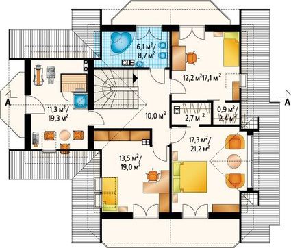 Пространство второго этажа представлено личными апартаменты. Предназначенные для отдыха и расслабления четыре комнаты оборудованы выходящими на разные стороны постройки балконами — мечта романтиков. Два помещения имеют дополнительную площадь под гардеробные. Интересен вариант переоборудования одной комнаты в детскую, игровую, тренажерный зал или бильярдную, что позволяет разнообразить отдых и сделать его содержательным.