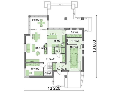 Внутреннее пространство дома поражает своей рациональностью. Первый этаж включает комнаты следующего назначения: