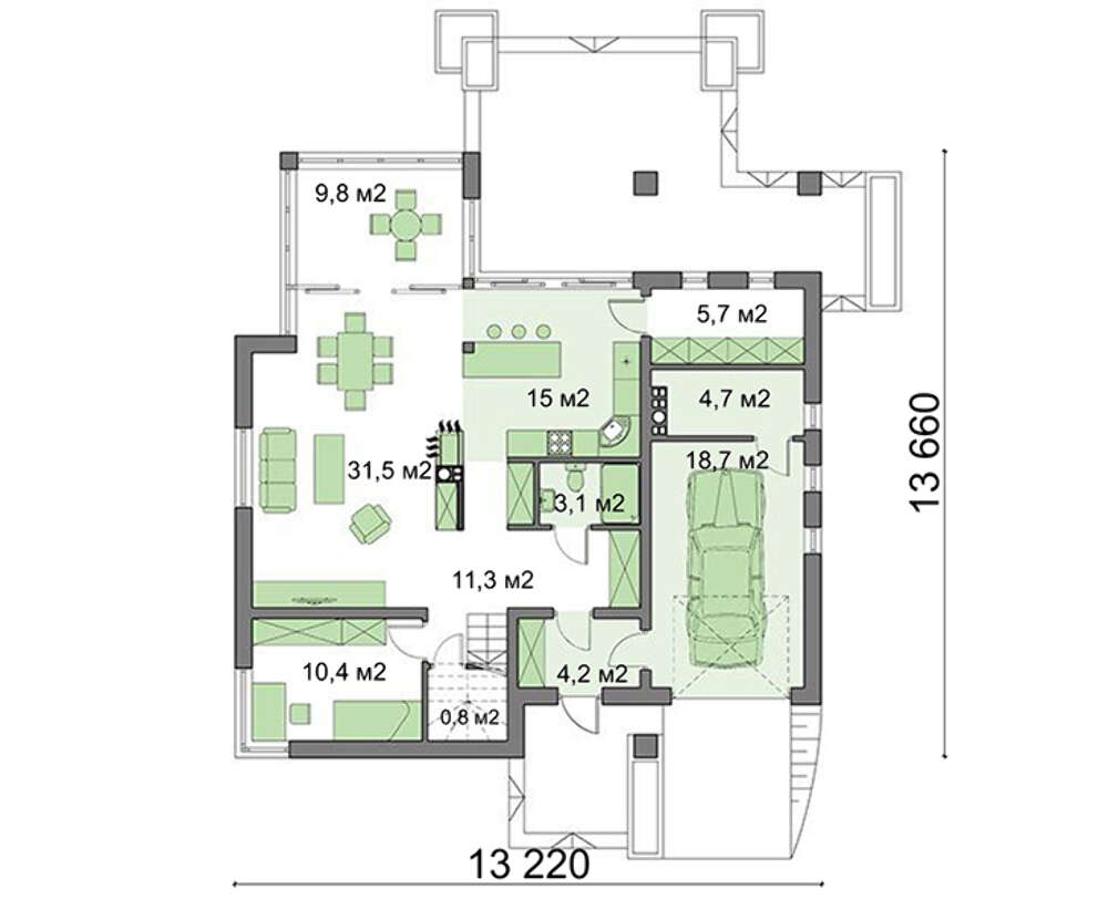 • большую гостиную, объединенную со столовой и кухней;