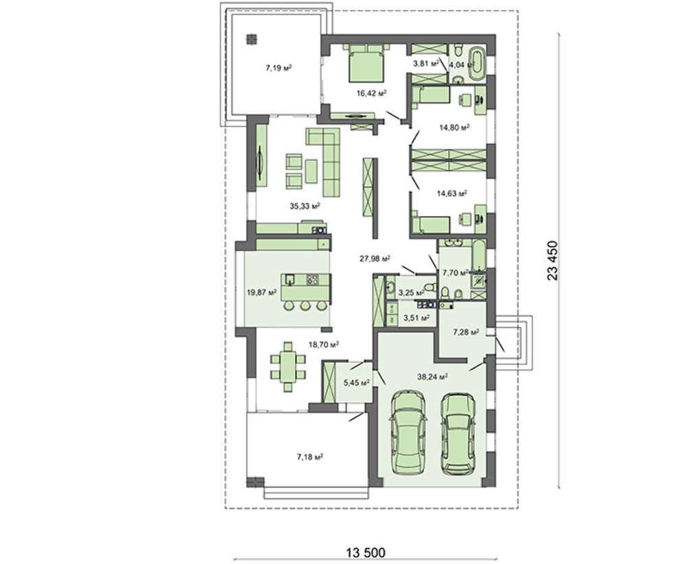 Схема комфортабельного одноэтажного жилого дома на 3 спальни и 3 санузла