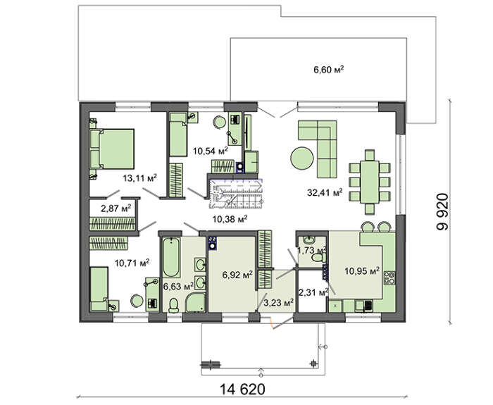 Проект содержит три раздела – Архитектурный, Конструктивный и Инженерный: водоснабжение, отопление, вентиляция, канализация, электроснабжение (приобретается за дополнительную плату) + Пояснительная записка.
