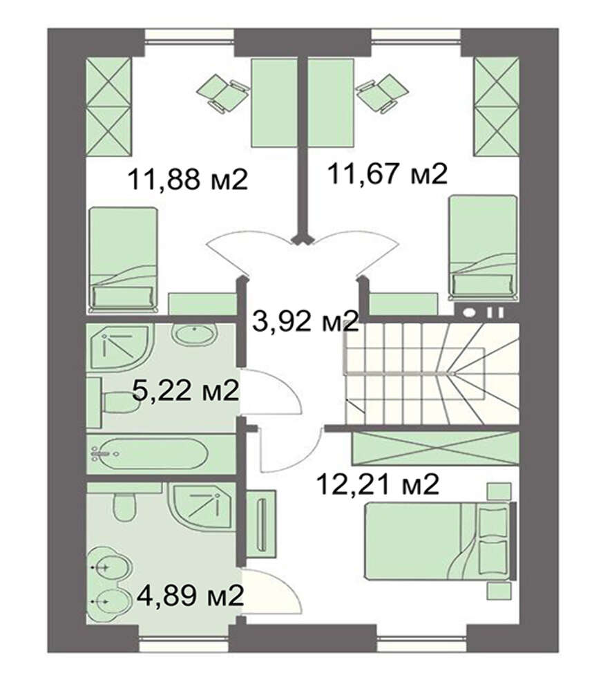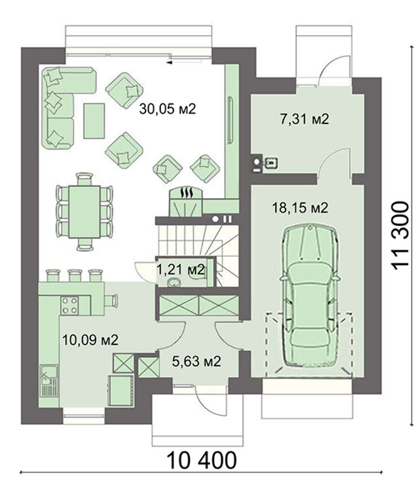 Первый этаж представлен помещениями для общего проведения времени всеми членами семьи. Площадью в 18 м2 гараж решает проблему с одержания транспортного средства, примыкающее помещение традиционно используется для хранения, требуемого для обслуживания инструмента, и выполнения слесарных работ по дому.