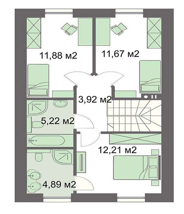 В проекте предусмотрены три спальни, все они находятся на втором тихом этаже. В апартаментах хозяина учтен дополнительный санузел.
