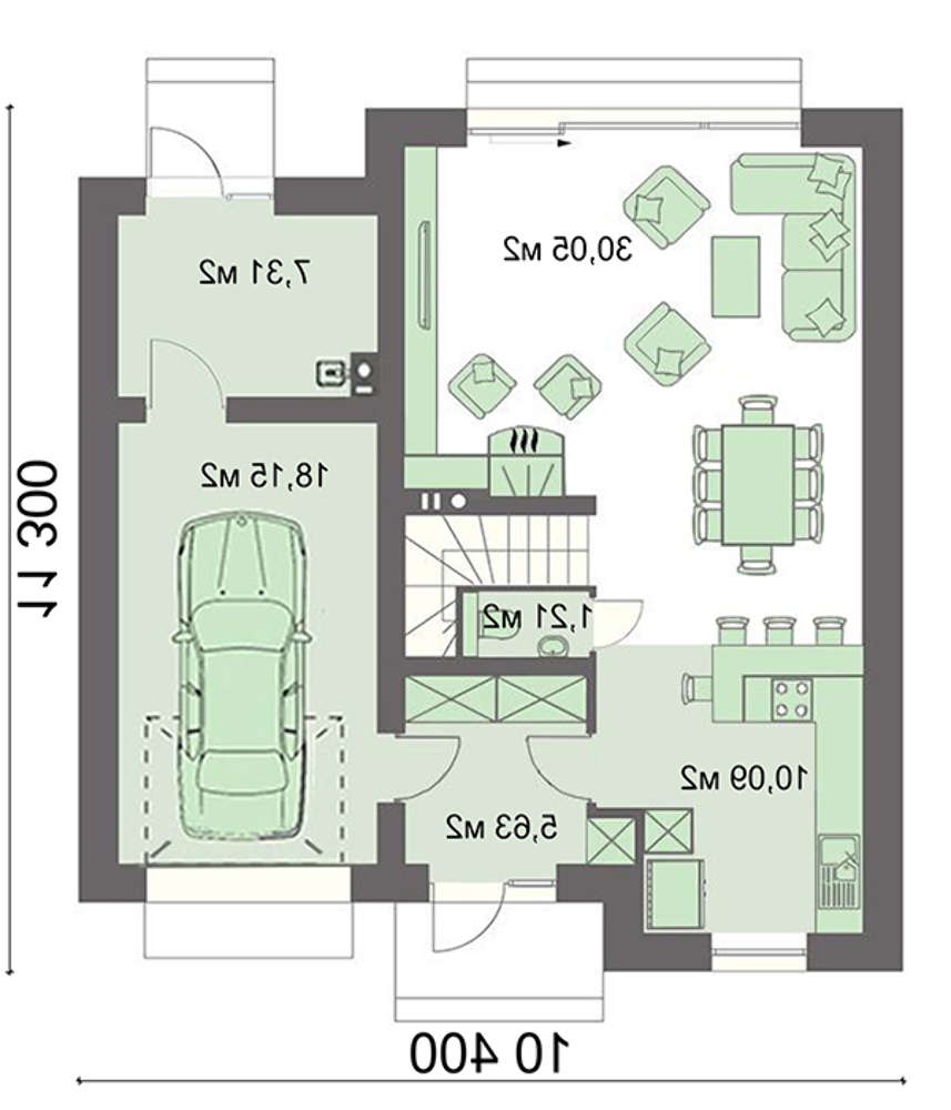 Первый этаж представлен помещениями для общего проведения времени всеми членами семьи. Площадью в 18 м2 гараж решает проблему с одержания транспортного средства, примыкающее помещение традиционно используется для хранения, требуемого для обслуживания инструмента, и выполнения слесарных работ по дому.