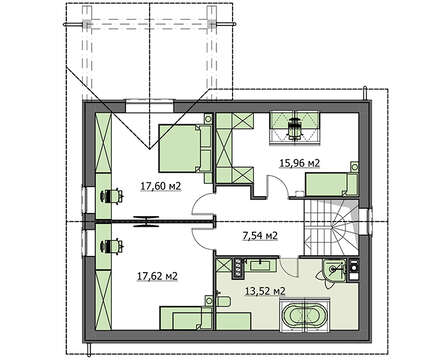 На втором этаже запланирована территория сна. Здесь находятся три просторные спальни, санузел с гидробоксом и массажной ванной.