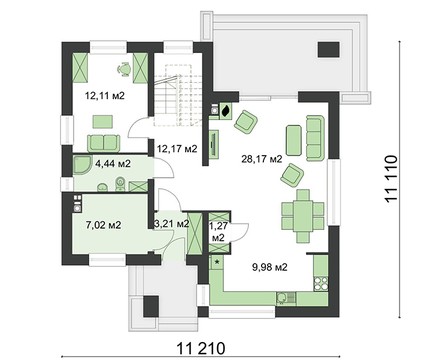 Первый этаж не имеет личных помещений, это зона дневного времени. Просторная гостиная оформлена в виде студии, в ее габариты включена столовая и кухня. Для удобства отдыхающих зона приготовления пищи отнесена в самое удаленное место, в противоположной части находится вход на террасу. К дополнительным помещениям первого этажа относится гардероб, топочная и санузел. Предполагаемое назначение изолированной комнаты в 12 квадратов – это кабинет. При необходимости помещение может послужить спальней старшего поколения или приютить задержавшегося гостя.