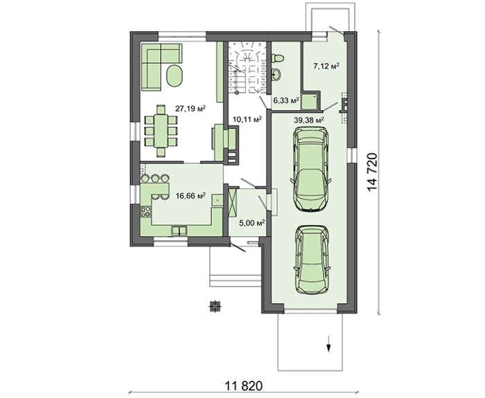 На первом этаже нет жилых помещений. Большую часть занимает гостиная и столовая. Они оформлены отдельными комнатами. Столовая и кухня объединены, хозяйка получила возможность быстро накрывать и обслуживать большие празднества. Автолюбителям подготовлен подарок в виде просторного гаража. Площади достаточно, чтобы разместить два автомобиля, организовать мастерскую, склад инструмента и запчастей. В масштабах дома запланировано три санитарных узла. Помимо личного в хозяйских апартаментах, два общих разнесены по этажам.