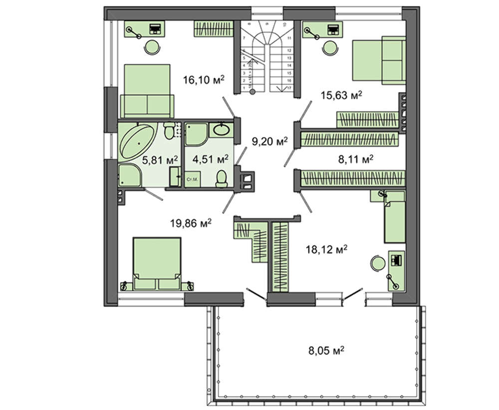 Данный проект можно использовать для строительства просторного жилого дома. Четыре спальни помогут разместить большую семью из нескольких поколений. Все личные апартаменты находятся на втором этаже, практически не отличаются размерами. Они просторные, их площадь позволит установить всю необходимую мебель и гардероб. Комната хозяина включает собственный санузел. Особое внимание стоит обратить на балкон, его площадь в 8 квадратов можно использовать для организации зоны отдыха, проведения чаепитий или зажигательных молодежных вечеринок под звездным небом.