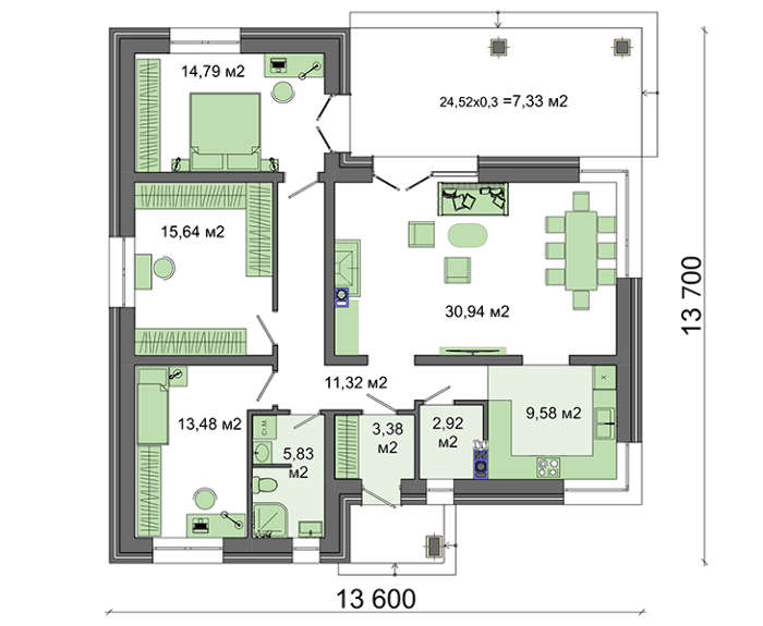 Кухне выделена отдельная территория, расположение поближе к выходу упрощает доставку провианта. Две спальни предназначены для членов семьи. Они предусмотрительно отделены друг от друга и рассчитаны на большую свободу проживания. По замыслу проектировщиков, третья изолированная комната должна быть использована для гардероба. Она просторная, имеет большое окно, поэтому никто не запрещает помещение использовать под третью спальню, личный кабинет, мастерскую или детскую.