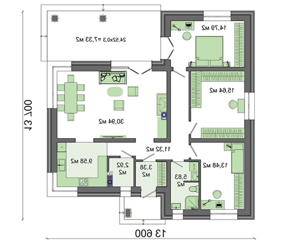 Кухне выделена отдельная территория, расположение поближе к выходу упрощает доставку провианта. Две спальни предназначены для членов семьи. Они предусмотрительно отделены друг от друга и рассчитаны на большую свободу проживания. По замыслу проектировщиков, третья изолированная комната должна быть использована для гардероба. Она просторная, имеет большое окно, поэтому никто не запрещает помещение использовать под третью спальню, личный кабинет, мастерскую или детскую.