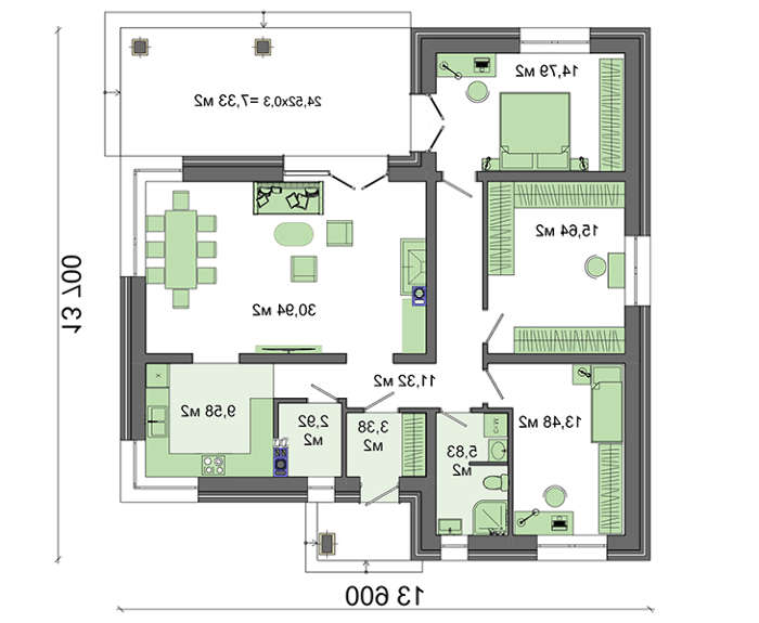 Схема одноэтажного дома с колоннами и просторной зоной для летнего отдыха