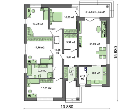 Зона общего времяпрепровождения представлена большой гостиной, в которую включена столовая. На площади свыше 30 кв. м можно разместить количество мебели, достаточное для крупной вечеринки. Выход из гостиной прямо на террасу вносит разнообразие в отдых и позволяет при хорошей погоде дружескую встречу перенести прямо на простор участка. Кухня отделена и включает дополнительное помещение, его удобно использовать для хранения бытовой техники и пищевых запасов.