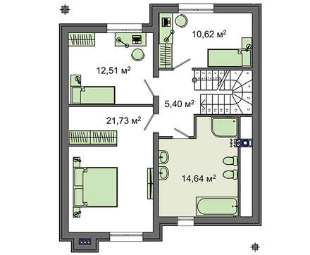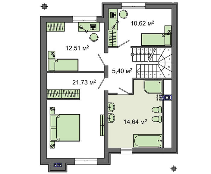 Жилая площадь коттеджа представлена четырьмя комнатами отдыха. Три из их находятся на втором этаже, имеют практически одинаковые размеры, более 10 кв. м. Апартаменты первого уровня могут быть выделены старшему поколению под спальню или меблированы под кабинет. Среди комнат второго этажа особенно выделяется хозяйские апартаменты. Их площадь почти в 22 квадрата позволяет разделить помещение на две части и оборудовать личный гардероб.