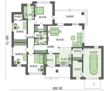 Противоположную часть дома занимает просторный встроенный гараж на один автомобиль. Примыкающее помещение площадью на 7 кв. м может быть использовано в качестве слесарной мастерской для обслуживания транспорта. Объединяющая центральная часть отдана под гостиную, в площадь которой дополнительно включены столовая и кухня. Место для приготовления пищи полуизолировано. Гостевое помещение имеет прямой выход на уютную веранду. Планировка позволяет часть дружеской встречи перенести на загородный участок и продолжить ее среди ароматных роз и ажурных беседок.