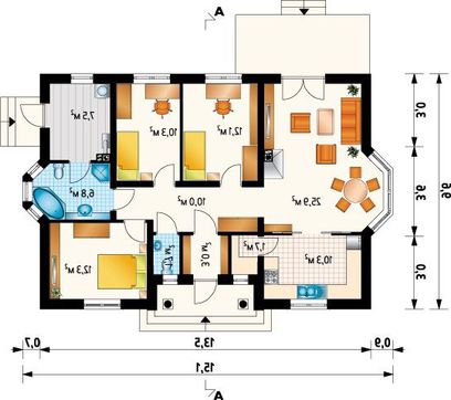 Симпатичный домик с эркером на своем одном этаже помещает все необходимое для уюта и комфорта. Три удобные спальни выполнены отдельно и позволяют отдохнуть и расслабится в любое время дня. Особенность планировки в особой комнате, выполненной уединенно, которую можно использовать при выполнении хозяйственных работ: стирка, сушка белья, под мастерскую.