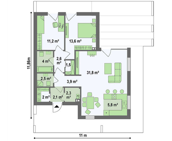 Проект содержит три раздела – АрхитектурныйКонструктивный и Инженерный: водоснабжение, отопление, вентиляция, канализация, электроснабжение (приобретается за дополнительную плату) + Пояснительная записка.