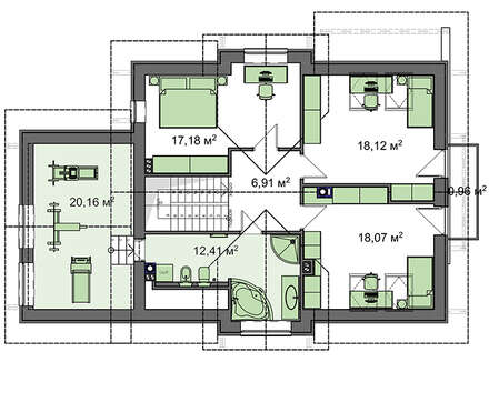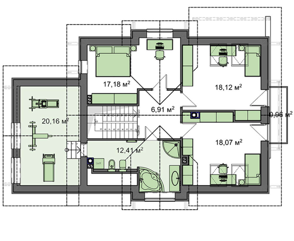 Второй уровень – это зона ночи, место для апартаментов домочадцев. Две из спален детские, третья предназначена для главы семьи. Площадь над гаражом позволяет обустроить бытовое помещение или прачечную.