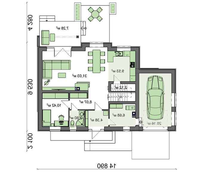 Гордостью дома считается просторный гостиный зал. Он объединил зону отдыха, места приема и приготовления пищи. В центре помещения установлен камин. Возле него долгими зимними вечерами будут собираться обитатели дома на совместные посиделки. В летнее время продолжением гостиной станет большая веранда, можно установить шезлонги для отдыха и обеденный стол для семейных трапез на свежем воздухе.