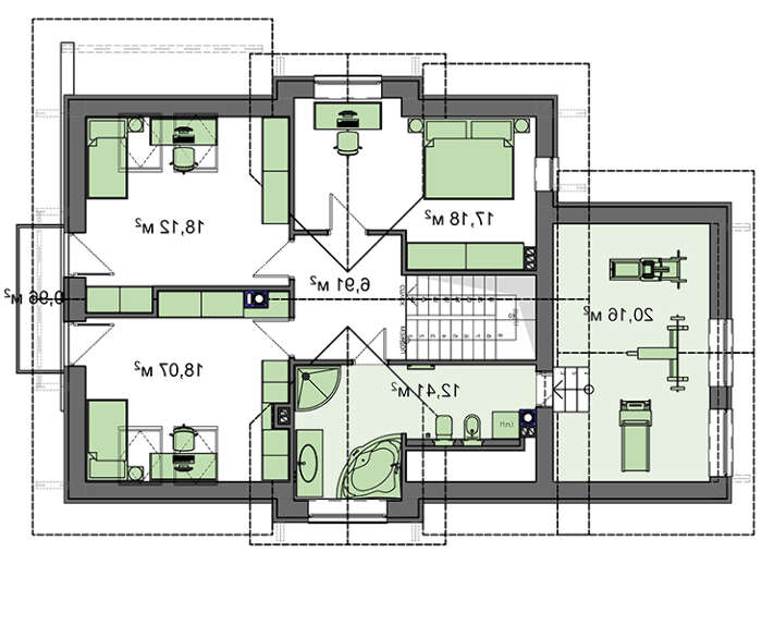 Второй уровень – это зона ночи, место для апартаментов домочадцев. Две из спален детские, третья предназначена для главы семьи. Площадь над гаражом позволяет обустроить бытовое помещение или прачечную.